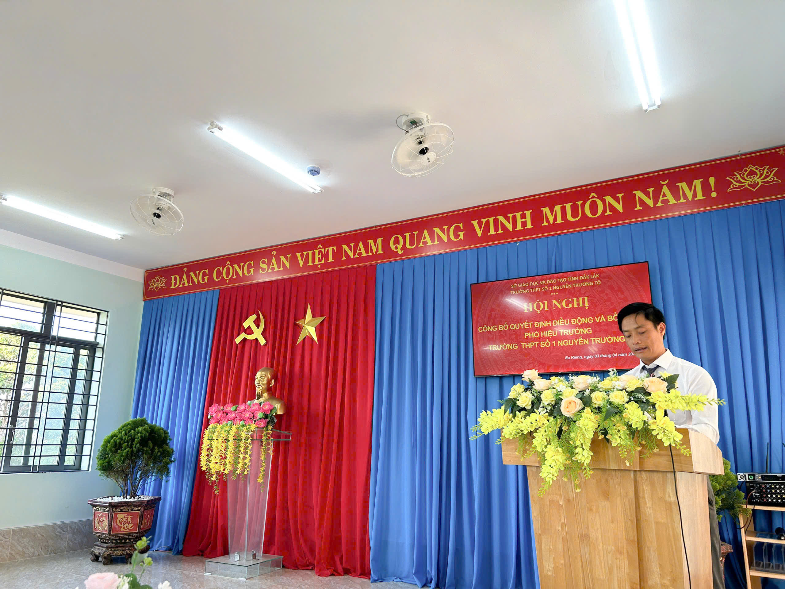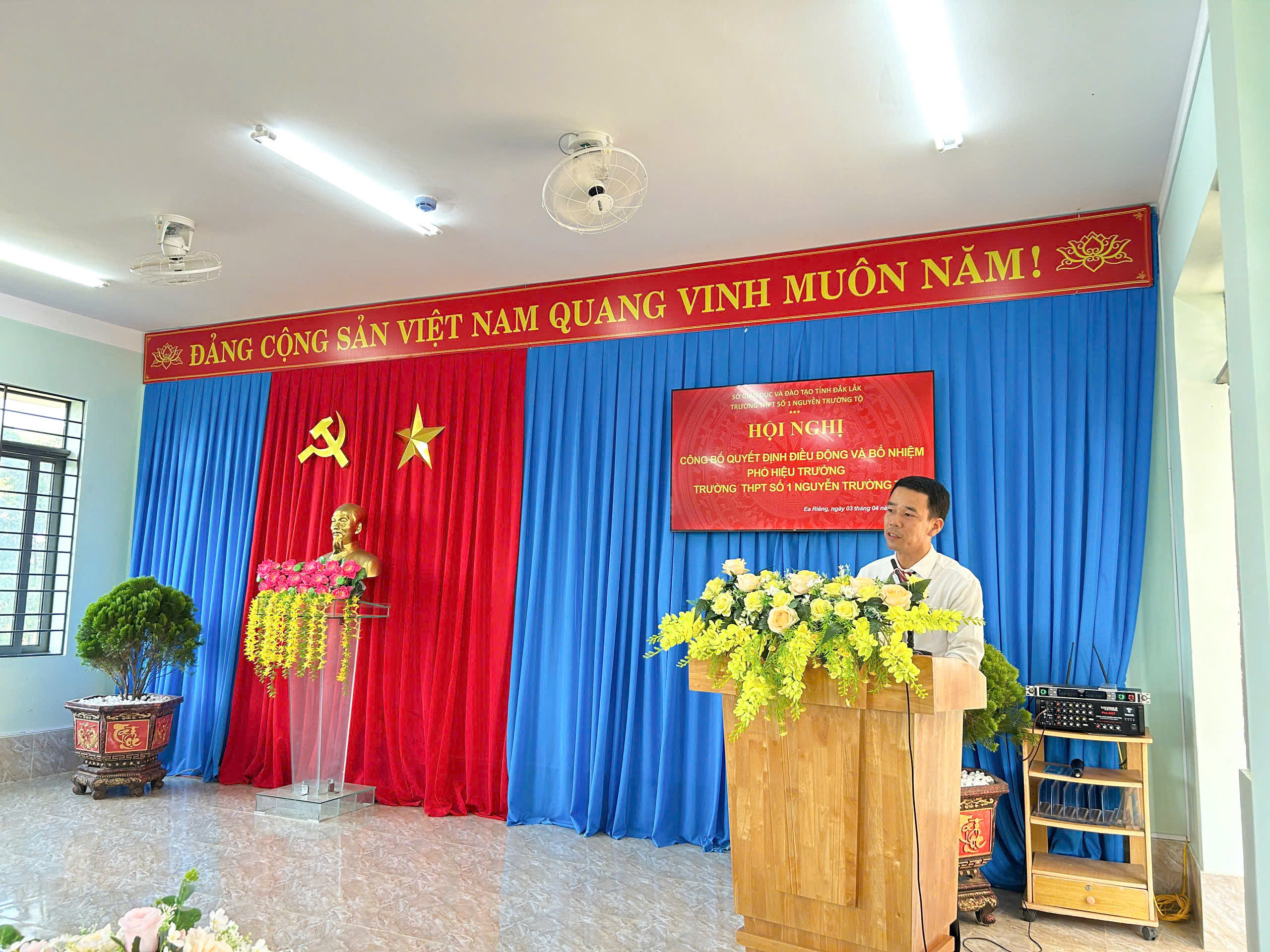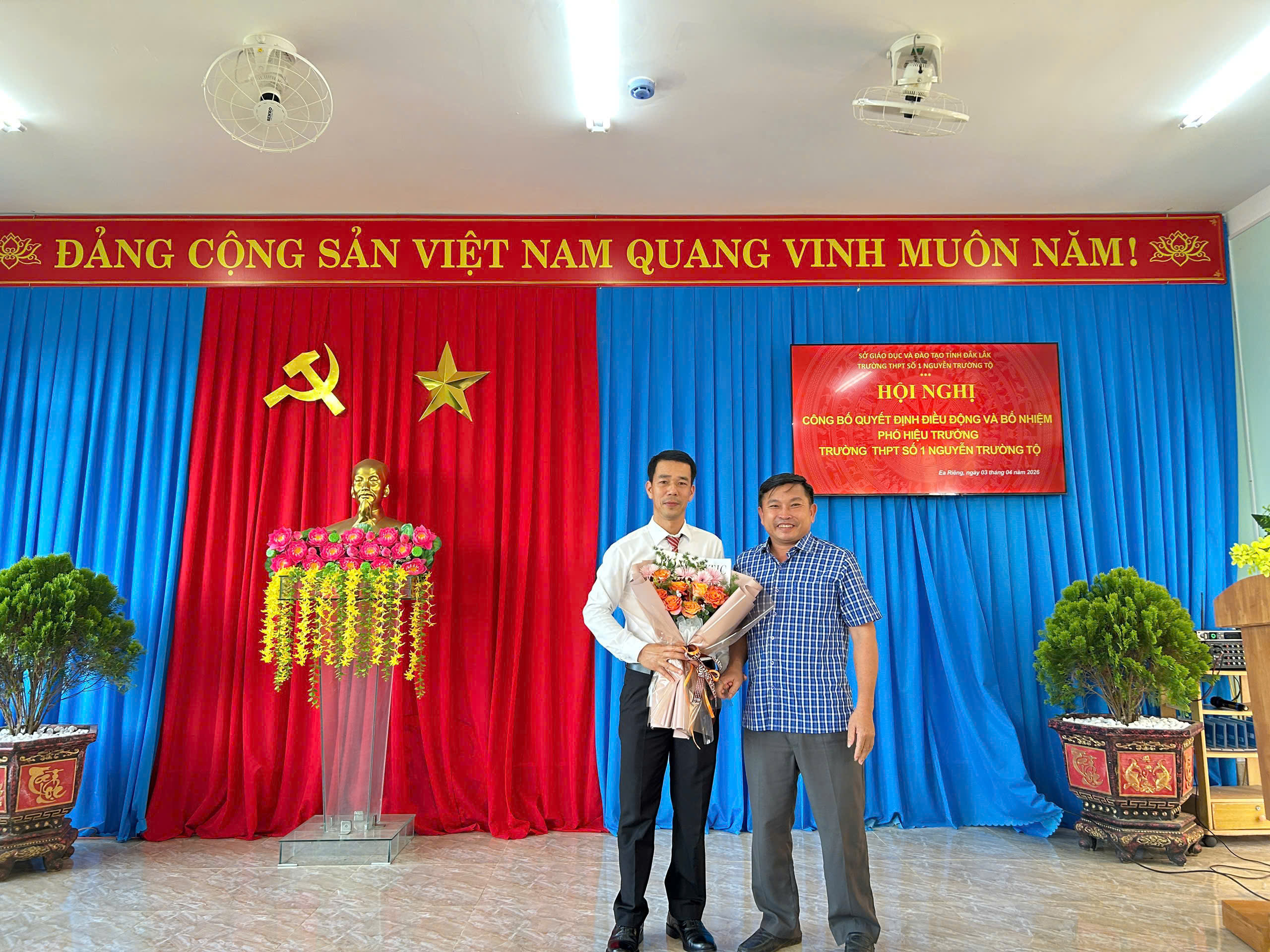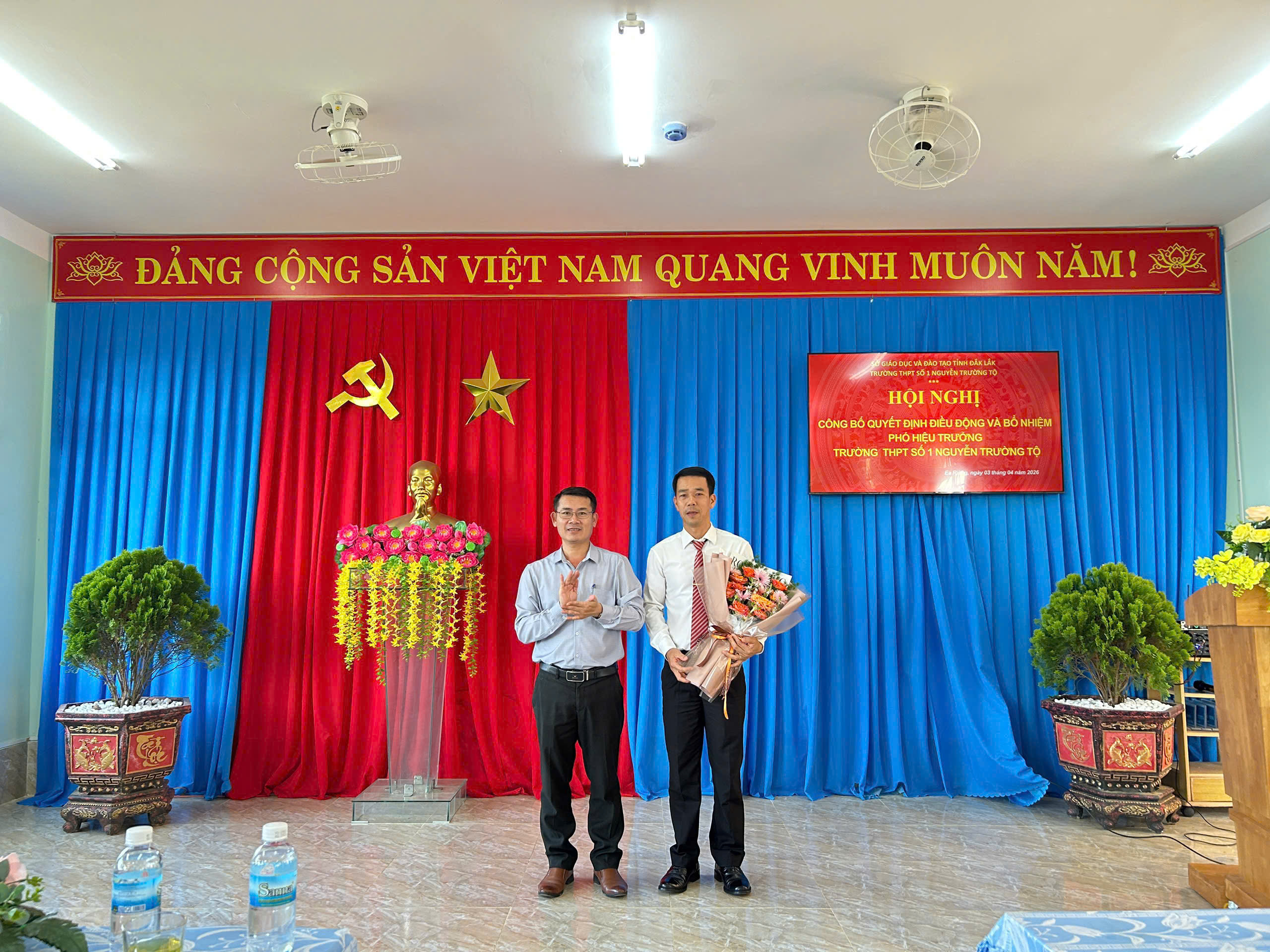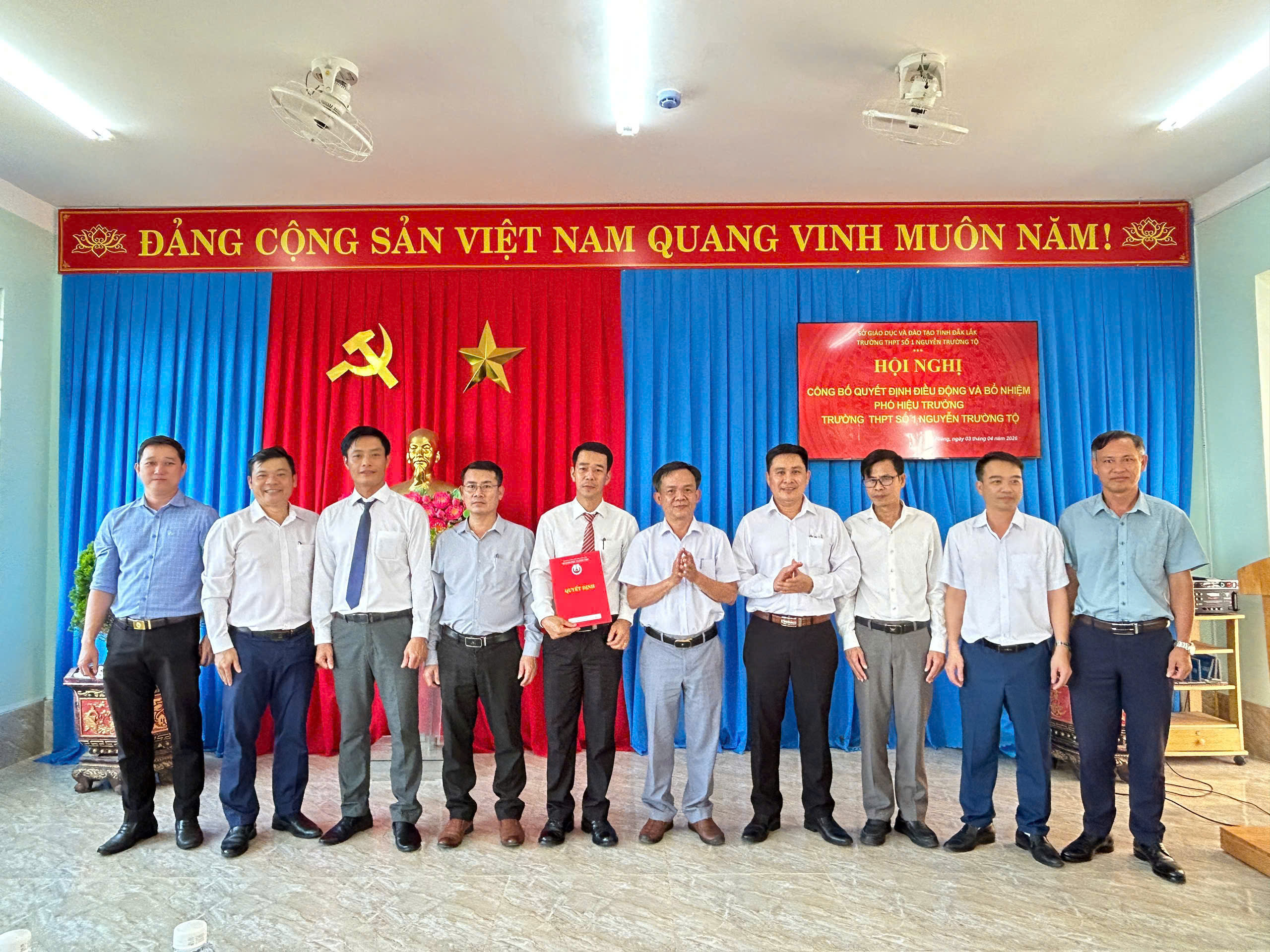 Chiều 03/04/2026, Trường THPT Số 1 Nguyễn Trường Tộ long trọng tổ chức lễ công bố Quyết định của Sở Giáo dục và Đào tạo tỉnh Đắk Lắk về việc điều động, bổ nhiệm thầy Nguyễn Khắc Kính giữ chức vụ Phó Hiệu trưởng nhà trường. Sự kiện không chỉ kiện toàn bộ máy lãnh đạo mà còn mở ra kỳ vọng mới về chuyển đổi số, nâng cao chất lượng giáo dục và phát triển bền vững trong giai đoạn mới. Theo Quyết định của Giám đốc Sở Giáo dục và Đào tạo tỉnh Đắk Lắk, Ông Nguyễn Khắc Kính, giáo viên Trường THPT Nguyễn Tất Thành, được điều động đến nhận công tác và bổ nhiệm giữ chức vụ Phó Hiệu trưởng Trường THPT Số 1 Nguyễn Trường Tộ kể từ ngày 02/4/2026. Buổi lễ diễn ra trong không khí trang trọng, ấm áp với sự tham dự của đại diện Sở GD&ĐT, đại diện Đảng ủy xã Ea Riêng cung toàn thể lãnh đạo, giáo viên và nhân viên nhà trường