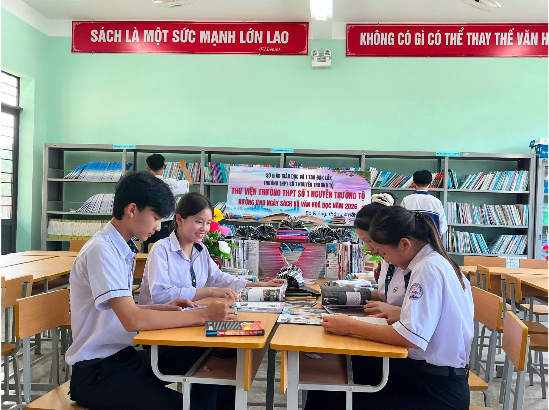 Thực hiện Công văn số 1000/SGDĐT-GDPT ngày 15/04/2026 của Sở GDĐT Đắk Lắk về việc hướng dẫn tổ chức hoạt động hưởng ứng Ngày Sách và Văn hóa đọc Việt Nam năm 2026 , Trường THPT số 1 Nguyễn Trường Tộ đã triển khai chuỗi hoạt động đầy ý nghĩa nhằm tôn vinh giá trị của sách và thúc đẩy phong trào học tập suốt đời với thông điệp “Lan toả văn hóa đọc trong kỷ nguyên số”. Việc đọc sách không chỉ giúp các thầy cô và các em học sinh nâng cao kiến thức, rèn luyện kỹ năng mà còn là phương pháp giải tỏa căng thẳng lành mạnh sau những giờ học. Tại thư viện trường THPT số 1 Nguyễn Trường Tộ, hình ảnh thầy cô và các bạn học sinh say sưa bên từng trang sách đã trở thành một nét đẹp văn hóa quen thuộc của nhà trường. Kết nối tri thức bốn phương, bồi dưỡng tâm hồn và làm giàu tri thức. Sự ra đời của Ngày Sách và Văn hóa đọc Việt Nam theo Quyết định số 1862/QĐ-TTg của Thủ tướng Chính phủ một lần nữa khẳng định vai trò không thể thay thế của sách trong việc hình thành nhân cách và tư duy con người. Hãy cùng nhau duy trì thói quen đọc sách mỗi ngày để mỗi trang sách đều là một bước tiến trên hành trình chinh phục tri thức của mỗi chúng ta.